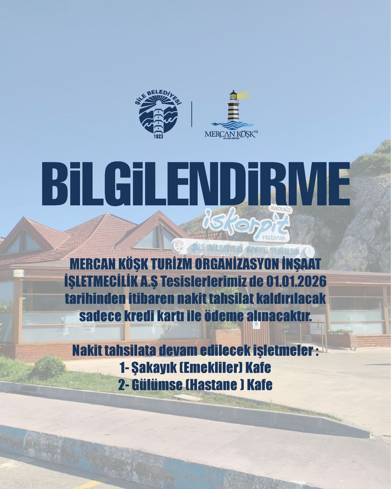 Mercan Köşk Turizm Organizasyon İnşaat İşletmecilik A.Ş.’ye bağlı tesislerimizde, 01 Ocak 2026 tarihinden itibaren nakit ödeme uygulaması sona erecektir.