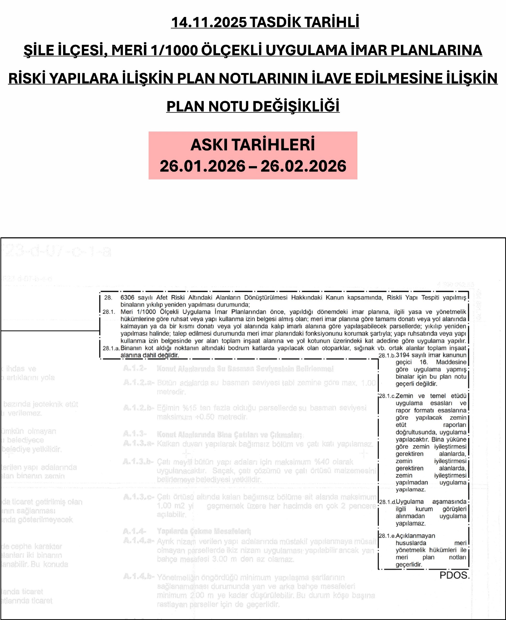 İstanbul Büyükşehir Belediyesi Planlama Şube Müdürlüğü’nün 16.01.2026 tarihli ve E-25955148-105.04-2026.130442 sayılı yazısı ile Başkanlığımıza iletilen; 10.11.2025 tarihli ve 2025/1195 sayılı İBB Meclis Kararı doğrultusunda İstanbul Büyükşehir Belediye Başkanı tarafından 14.11.2025 tarihinde onaylanan, UİP-341098227 plan işlem numaralı 1/1000 ölçekli Şile İlçesi, meri Uygulama İmar Planlarına Riskli Yapılara İlişkin Plan Notlarının İlave Edilmesine İlişkin Plan Notu Değişikliği, 26.01.2026 / 26.02.2026 tarihleri arasında 3194 sayılı İmar Kanunu’nun 8/b maddesi uyarınca 1 ay süre ile Plan ve Proje Müdürlüğü’nde askıya çıkarılmıştır.
