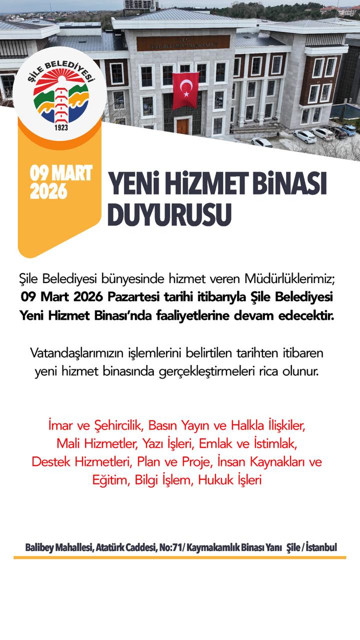 Belediyemiz bünyesinde hizmet veren aşağıdaki müdürlüklerimiz, 9 Mart 2026 Pazartesi günü itibarı ile Şile Belediyesi Yeni Hizmet Binası’nda hizmet vermeye başlayacaktır.