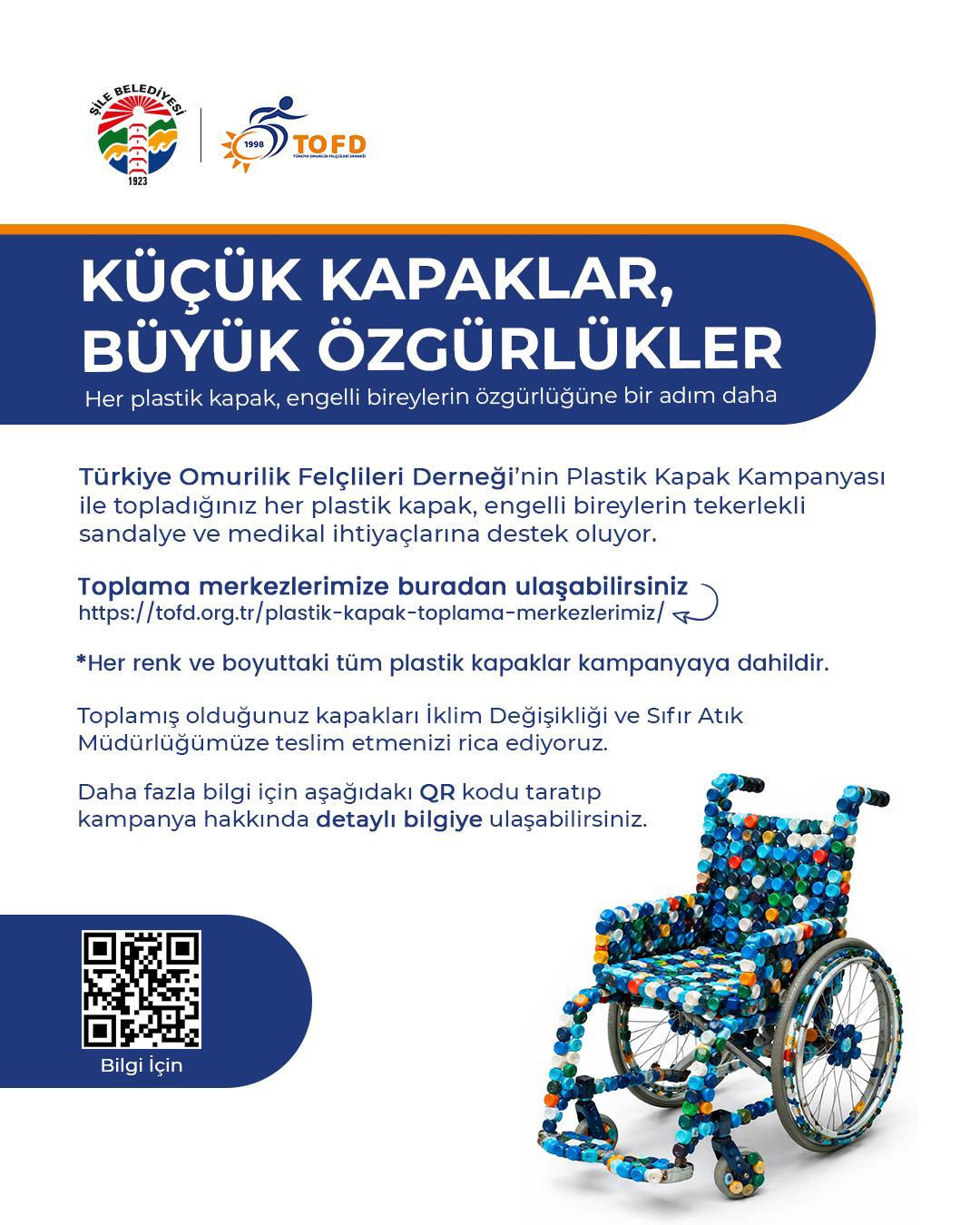 Türkiye Omurilik Felçlileri Derneği’nin Plastik Kapak Kampanyası kapsamında, Şile’de toplanan kapaklar; tekerlekli sandalye ve medikal ihtiyaçlara katkı sağlıyor.