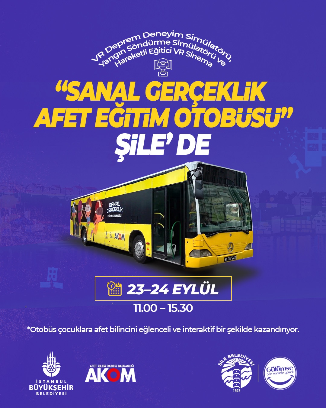 İBB Afet İşleri Dairesi Başkanlığı Afet Zarar Azaltma Şube Müdürlüğü tarafından donatılan otobüs; VR Deprem Deneyim Simülatörü, Yangın Söndürme Simülatörü ve Hareketli Eğitici VR Sinema ile çocuklara afet bilincini eğlenceli ve interaktif bir şekilde kazandırıyor.