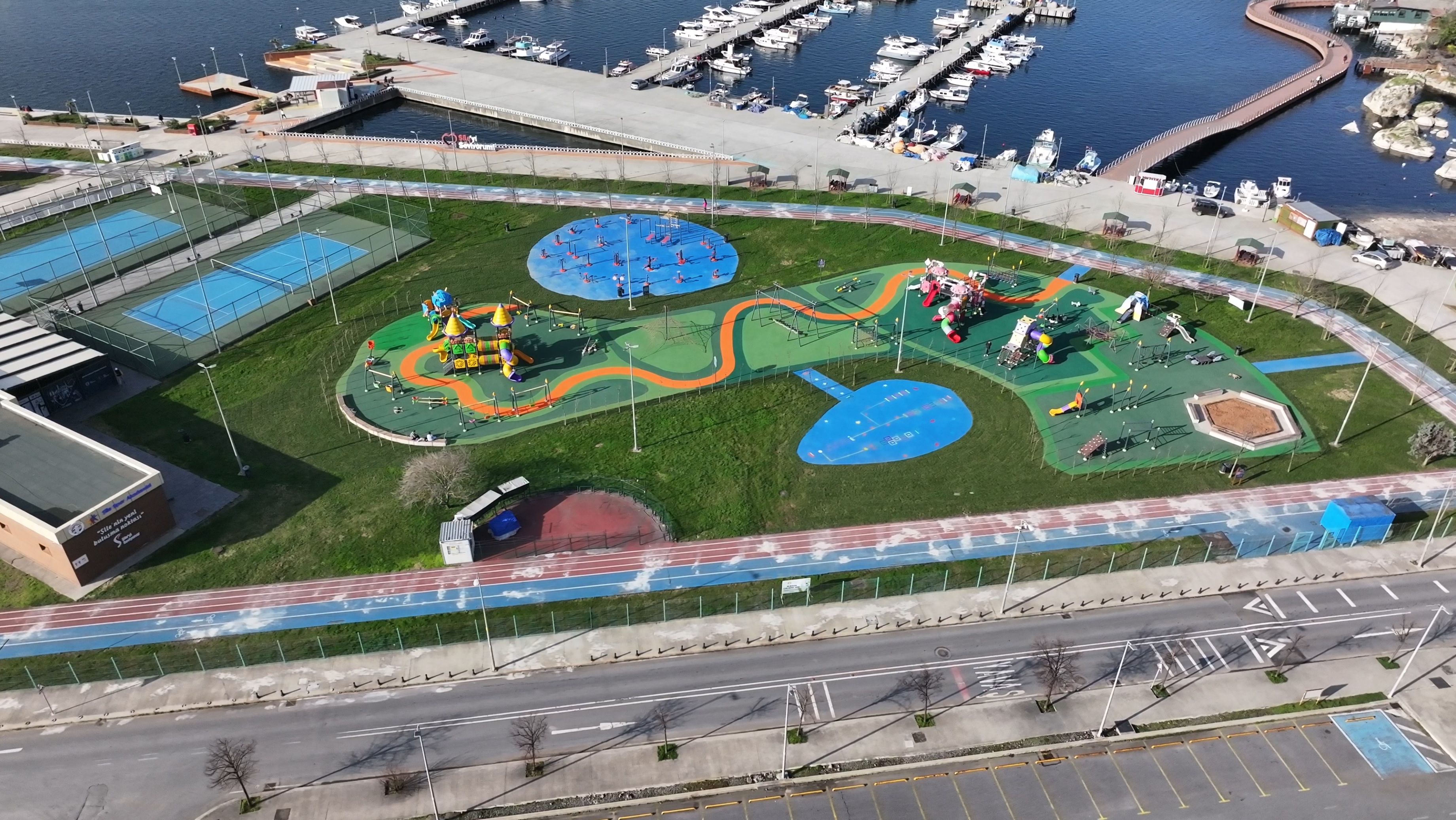 Marina’nın eşsiz manzarası eşliğinde tamamlanan yenileme çalışmalarında, parkın yıpranan zemin kaplamaları tamamen yenilendi ve titiz bir peyzaj düzenlemesiyle alana taze bir görünüm kazandırıldı. Özenle serilen ve canlı yeşil rengiyle parkın genel atmosferini değiştiren kauçuk zemin döşeme çalışmalarıyla, çocukların olası düşme ve çarpmalara karşı daha güvende olmaları sağlandı. Yenileme sonrasında, gece aydınlatmasıyla da dikkat çeken modern oyun grupları ve spor alanları, çocuklara ve ailelere daha işlevsel bir yaşam alanı sunmak üzere hazırlandı.